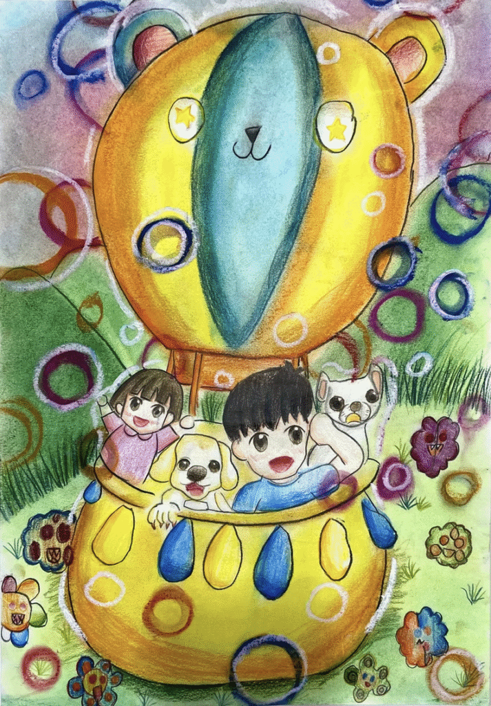 作品簡介:畫中是我兩隻狗、一隻名叫波波、一隻名叫小白、我幻想和妹妹還有我們的狗狗一起坐著熱氣球到連一個夢幻地方探險。